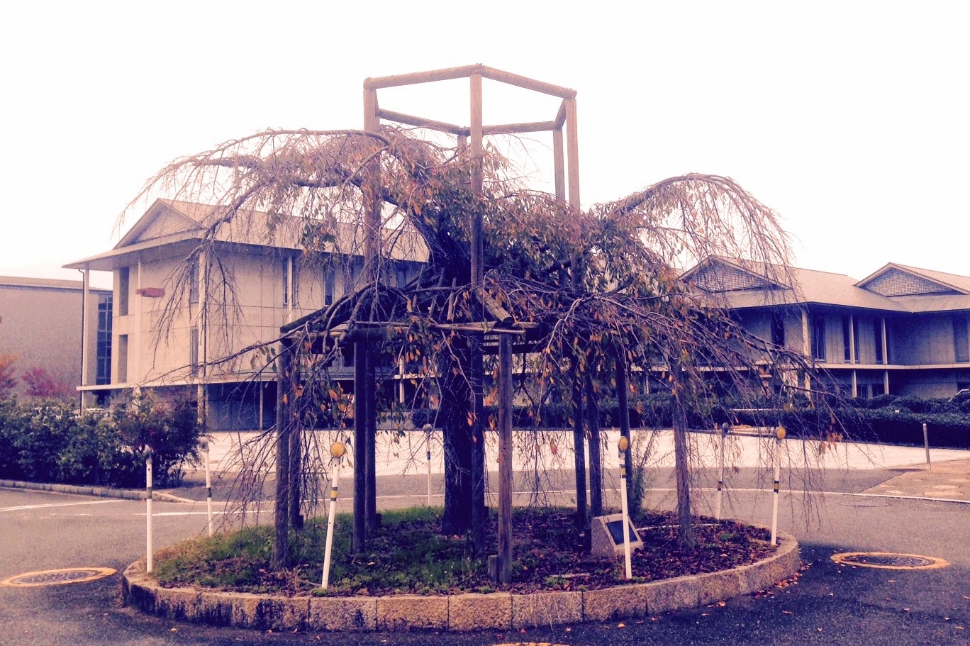 写真のとおり、真ん中に天井のように支柱が立っているが、もともとはこの上にまで枝があり、支柱は枝垂れる枝を受けていたもの。つまり、一回り二回り小さくなったことを表している。